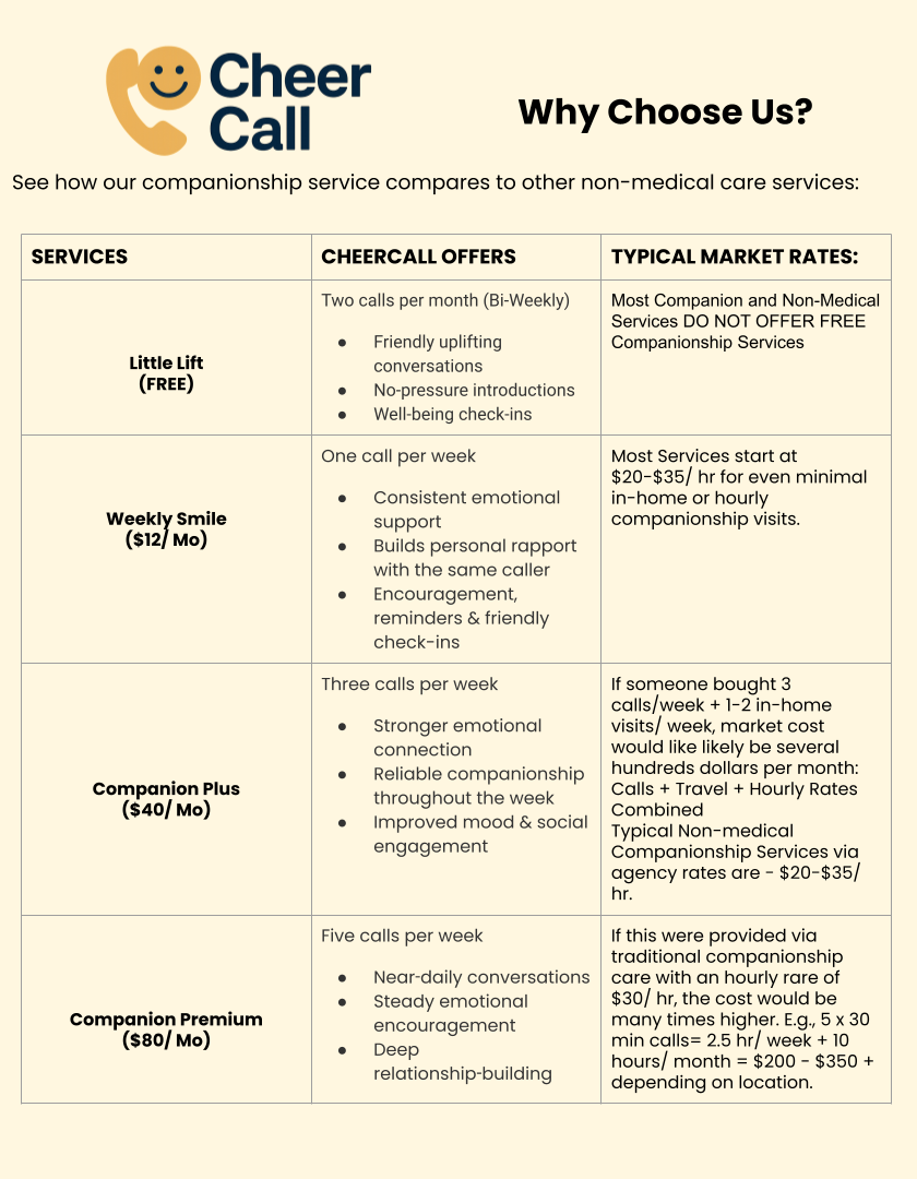 At CheerCall, every call is a meaningful conversation, not a 30-second safety script. Traditional companionship and non-medical services often charge significantly more for much less engagement.