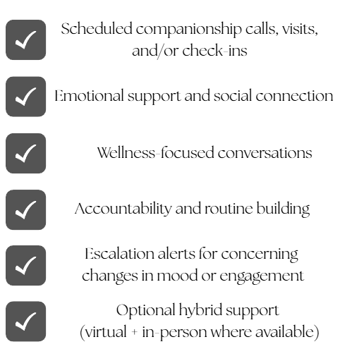 Structured companionship and engagement services designed for senior living communities, healthcare partners, and organizations seeking to reduce loneliness, improve satisfaction, and support better outcomes.
